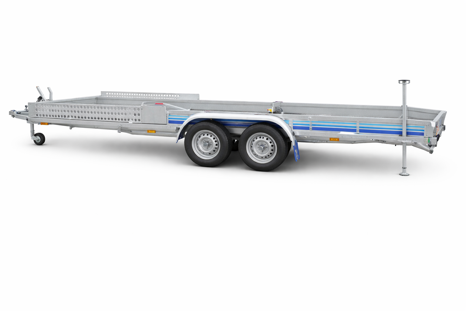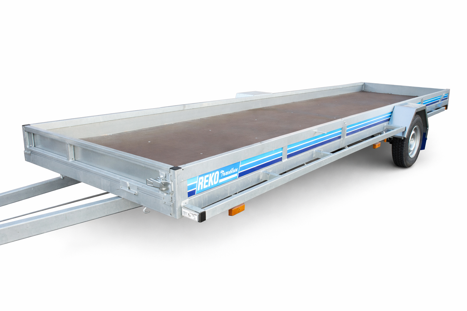 Bromsad släpvagn för ATV 650x150cm upp till 2000kg totalvikt 2-axlad, tippbart flak med odämpad tipp. Släpkärra. Lastförmåga 890, 990, 1090, 1190, 1290, 1390kg. Totalvikt 1500, 1600, 1700, 1800, 1900, 2000kg. Gammal bild, bakljus sitter under vagnen idag.
