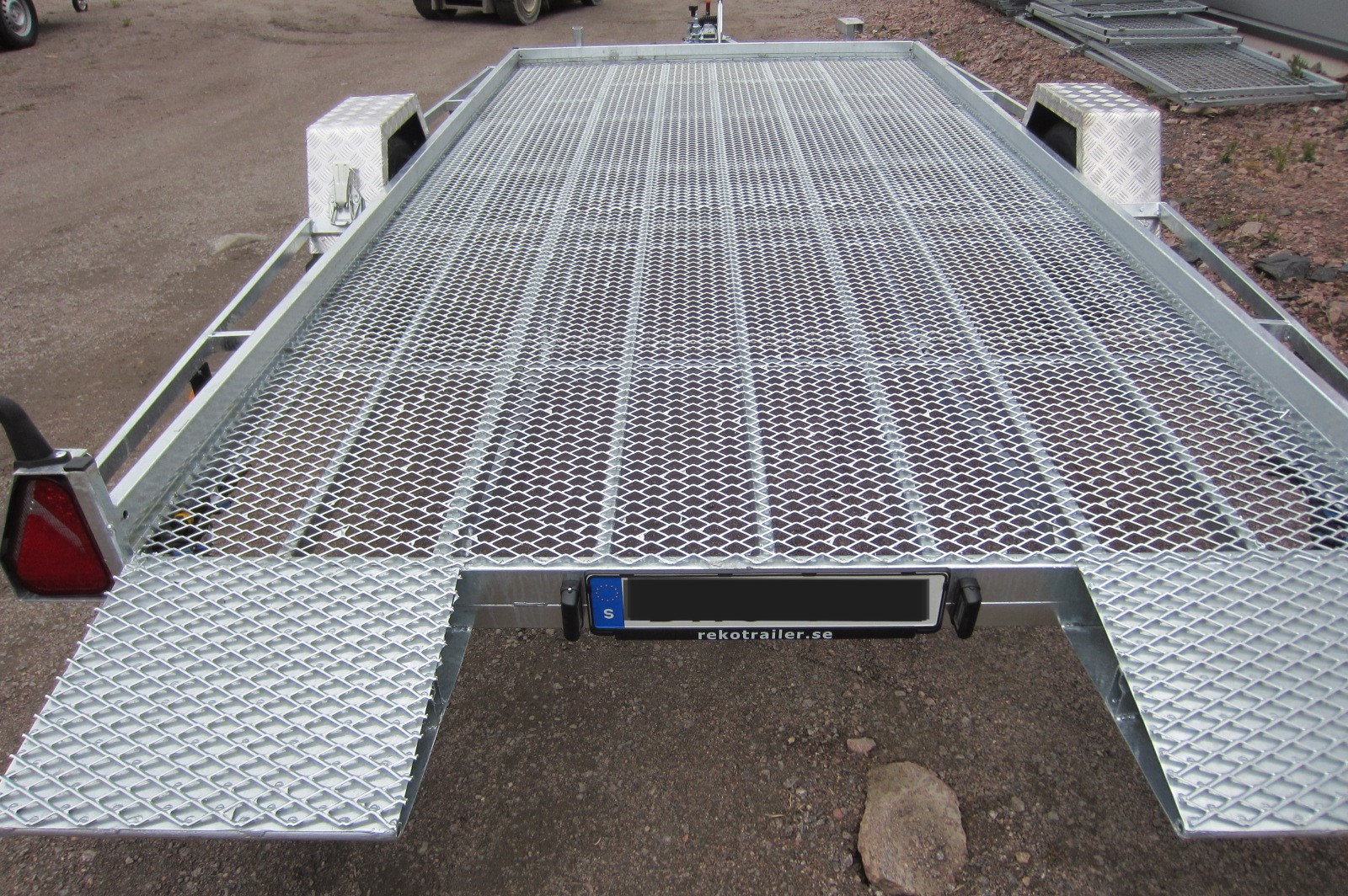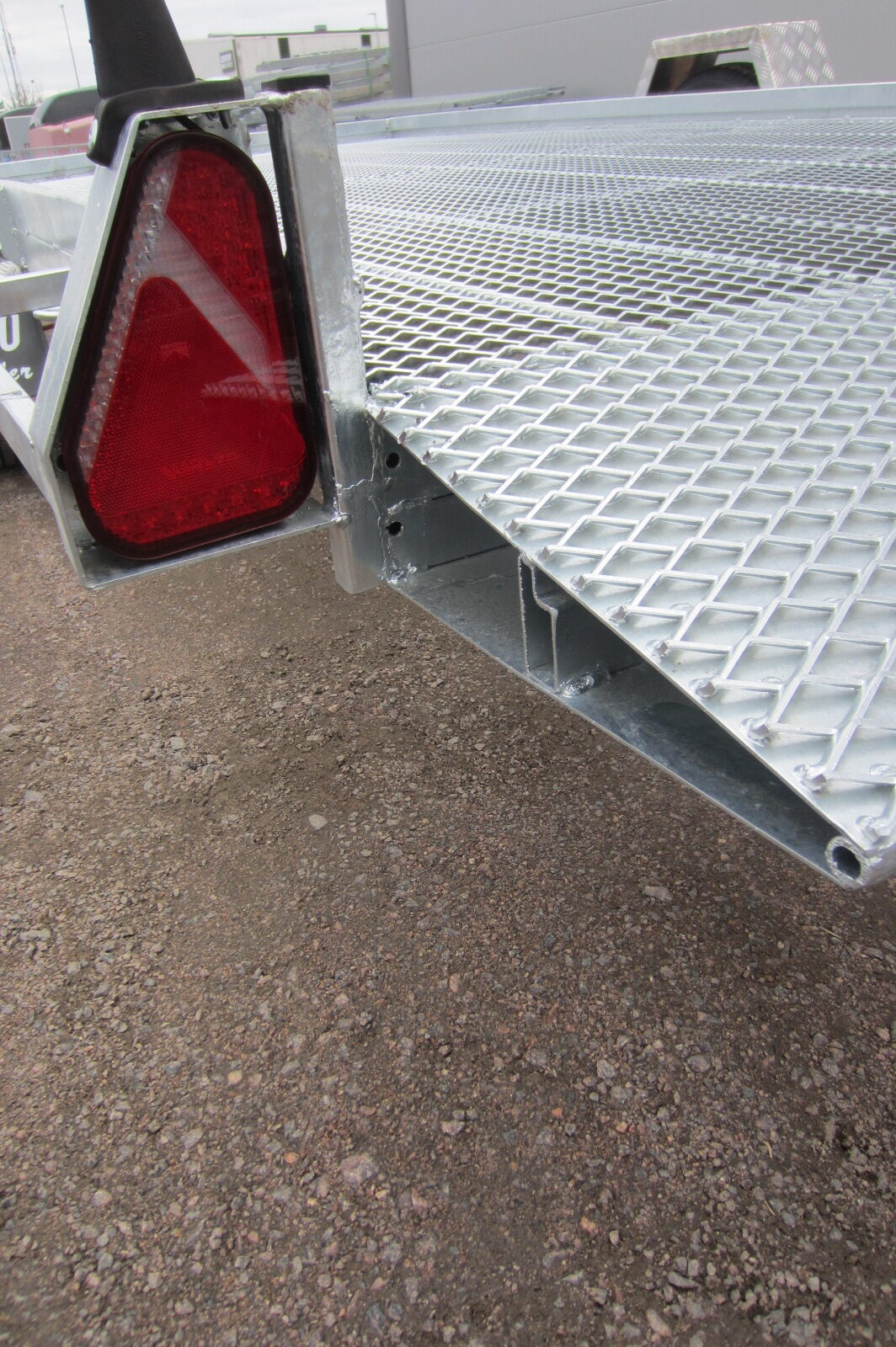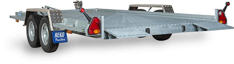 Biltrailer med lastyta 450 x 207cm. Totalvikter upp till 3000kg 2-axlad. Totalvikter: 2800, 2900, 3000kg. Lastförmåga: 1980, 2080, 2180kg. Riktigt stark och rejäl biltransport för tuffa tag med hel sträckmetallbotten.