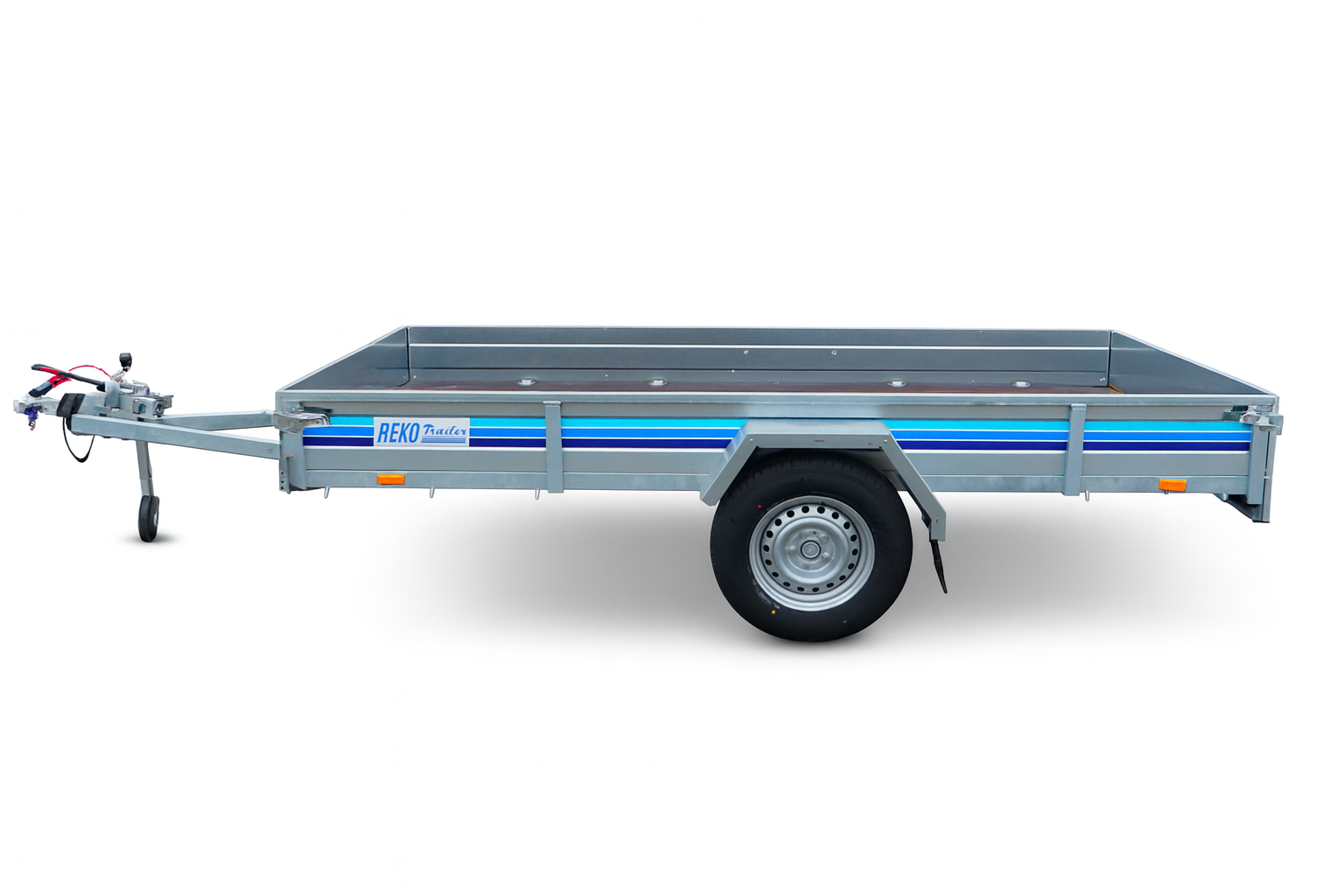Släpvagn med flakmått 369x150cm. Tippbart flak. Totalvikter: 1100, 1200, 1250, 1300 kg. Lastförmåga: 740, 840, 890, 940 kg. FF4973 har en 1350kg hjulaxel. Levereras med gasdämpad tipp, fast kabel 13 pol kontakt, rostfria lykthållare för positionsljus, utvändiga bindkrokar, invändiga surrningsöglor i lämsidan och stödhjul som standard. Baklämen håller för att köra upp tex. 4-hjuling eller klippare på vid lastning. Våra släpvagnar har lite längre dragbalkar vilket gör att de är mer följsamma och lättare att backa med.