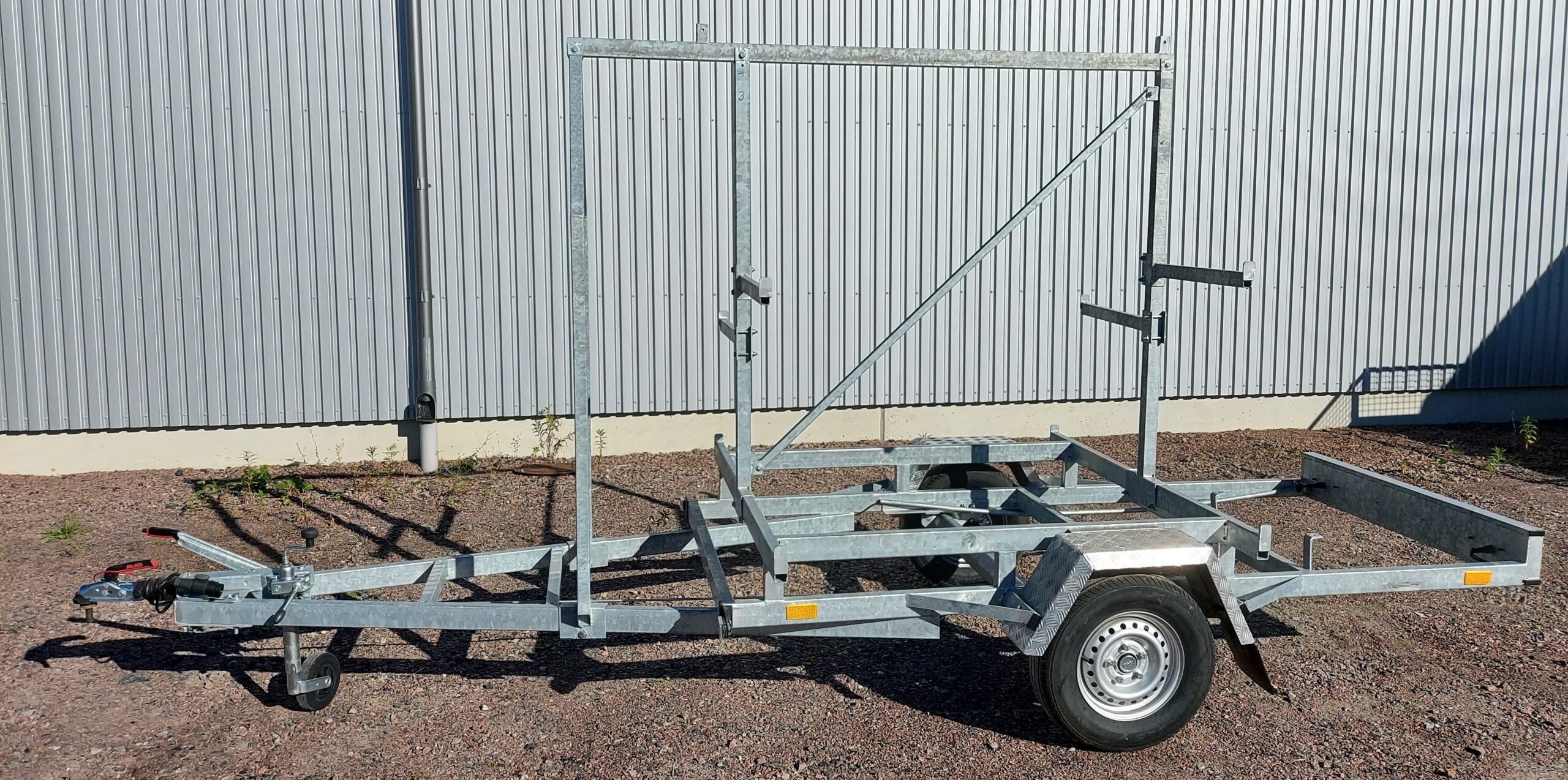 Ställningstrailer 750-1300kg totalvikt. Ställningsvagnen är tillverkad av stålprofiler i svetsade till ett självbärande chassi som varmförzinkats för bra rosttskydd. Aluminiumlåda fram och stålkorg bak ingår. Skärmar i kraftig durkaluminium. Stödhjul med förstärkt fäste.